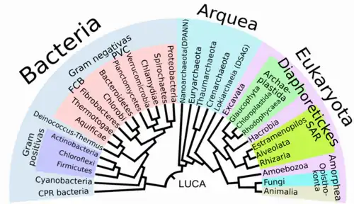 Los seres vivos se dividen actualmente en tres dominios: bacterias (Bacteria), arqueas (Archaea) y eucariotas (Eukarya). En los dominios Archaea y Bacteria se incluyen los organismos procariotas, esto es, aquellos cuyas células no tienen un núcleo celular diferenciado, mientras que en el dominio Eukarya se incluyen las formas de vida más conocidas y complejas (protistas, animales, hongos y plantas).