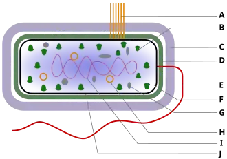 Puesto que las bacterias son procariotas no tienen orgánulos citoplasmáticos delimitados por membranas y por parecen presentar pocas estructuras intracelulares. Carecen de núcleo celular, mitocondrias, cloroplastos y de los otros orgánulos presentes en las células eucariotas, tales como el aparato de Golgi y el retículo endoplasmático.[65] Algunas bacterias contienen estructuras intracelulares rodeadas por membranas que pueden considerarse primitivos orgánulos, son llamados compartimentos procariotas. Ejemplos son los tilacoides de las cianobacterias, los compartimentos que contienen amonio monooxigenasa en Nitrosomonadaceae y diversas estructuras en Planctomycetota.[66]