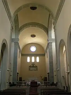 En el interior, la iglesia parece un templo grande y espacioso de estilo renacentista con planta de cruz latina . La nave central está separada de las dos naves laterales, de menor altura y anchura que la central, por cuatro arcos sostenidos por pilares a cada lado. De la intersección de las cuatro bóvedas de cañón de la nave, crucero y ábside, emerge una elegante bóveda de crucería con el escudo de los Médici en el centro, visible también en la bóveda del ábside.