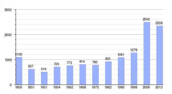 Los datos demográficos contemplados en este gráfico que están entre los años 1800 y 2013 de la comuna de Bagnoles-de-l'Orne[3] son los que constan en la página francesa EHESS/Cassini. Los demás datos se han cogido de la página del INSEE.[4]