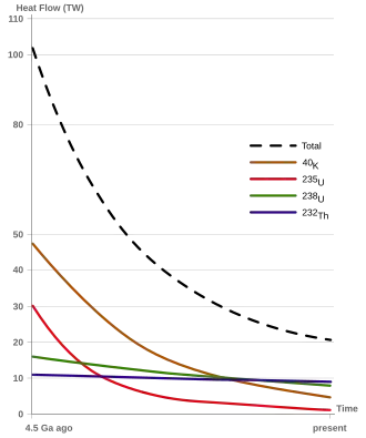 La descomposición radioactiva de los elementos en el manto y la corteza de la Tierra da como resultado la producción de isótopos hijos y la liberación de geoneutrinos y energía térmica, o calor radiógeno. Cuatro isótopos radioactivos son responsables de la mayoría del calor radiógeno debido a su enriquecimiento en relación con otros isótopos radiactivos: uranio-238 (238U), uranio-235 (235U), torio-232 (232Th) y potasio-40 (40K).[13] Debido a la falta de muestras de roca por debajo de 200 km de profundidad, es difícil determinar con precisión el calor radiogénico en todo el manto,[13] aunque hay algunas estimaciones disponibles.[14] Para el núcleo de la Tierra, los estudios geoquímicos indican que es poco probable que sea una fuente importante de calor radiológico debido a una baja concentración esperada de elementos radiactivos que se dividen en hierro.[15] La producción de calor radiógeno en el manto está vinculada a la estructura de convección del manto, un tema de mucho debate, y se piensa que el manto puede tener una estructura en capas con una mayor concentración de elementos radiactivos que producen calor en el manto inferior, o pequeños reservorios enriquecidos en elementos radiactivos dispersos por todo el manto.[16]