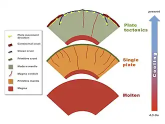 La controversia sobre la naturaleza exacta de la convección del manto hace que la evolución vinculada del presupuesto de calor de la Tierra y la dinámica y la estructura del manto sean difíciles de desentrañar.[16] Existe evidencia de que los procesos de la tectónica de placas no estaban activos en la Tierra antes de hace 3200 millones de años, y que la pérdida de calor interna de la Tierra podría haber estado dominada por la advección a través del vulcanismo de la tubería de calor.[19] Los cuerpos terrestres con flujos de calor más bajos, como la Luna y Marte, conducen su calor interno a través de una única placa litosférica, y los flujos de calor más altos, como en la luna Io de Júpiter, producen un transporte de calor advectivo a través del vulcanismo mejorado, mientras que la tectónica de placas activa De la Tierra ocurren con un flujo de calor intermedio y un manto de convección.[19]