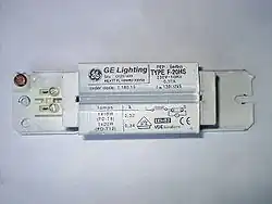 El balasto electrónico reemplaza el conjunto del balasto convencional, el cebador y el condensador. La carcasa que contiene los componentes tiene forma oblonga para encajar en el lugar de los viejos balastos en las luminarias.