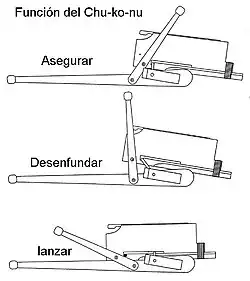 Era manejada moviendo una palanca hacia adelante y hacia atrás. En aquel movimiento, una flecha se colocaba en posición, la cuerda era tensada y mientras la flecha se disparaba, la siguiente estaba lista para tomar su lugar.