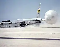 ![]() El NB-52B Balls 8 despegando en la Edwards AFB en 2004. El avión experimental X-43 se encuentra prendido bajo el ala derecha.