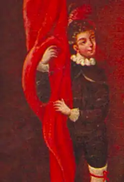 ![]() Retrato de Baltasar Temiño de Velasco sosteniendo el pendón real en el escudo de Zacatecas | ||