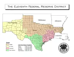 El Banco de la Reserva Federal de Dallas cubre el Undécimo Distrito del Sistema de la Reserva Federal de los Estados Unidos, que incluye Texas, el norte de Luisiana y el sur de Nuevo México. Tiene oficinas en El Paso, Houston y San Antonio. El banco se encuentra propiamente en el área superior de Oak Lawn, justo al norte del centro de Dallas.
