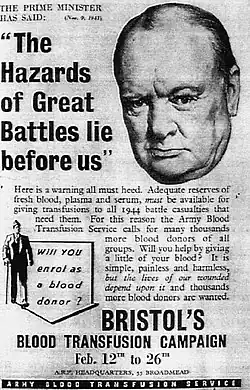 Frederic Durán-Jordà huyó a Gran Bretaña en 1938 y trabajó con Janet Vaughan en la Royal Postgraduate Medical School del Hospital Hammersmith para crear un sistema de bancos de sangre nacionales en Londres.[19] Ante el inminente estallido de la guerra en 1938, la Oficina de Guerra creó el Depósito de Suministros de Sangre del Ejército (ABSD) en Bristol, dirigido por Lionel Whitby y con el control de cuatro grandes depósitos de sangre en todo el país. Durante la guerra, la política británica consistió en suministrar sangre al personal militar desde depósitos centralizados, a diferencia de lo que hacían los estadounidenses y los alemanes, que sangraban a las tropas en el frente para obtener la sangre necesaria. El método británico demostró tener más éxito a la hora de satisfacer adecuadamente todas las necesidades y se desangraron más de 700.000 donantes en el transcurso de la guerra. Este sistema evolucionó hasta convertirse en el Servicio Nacional de Transfusión de Sangre establecido en 1946, el primer servicio nacional que se puso en marcha.[20]