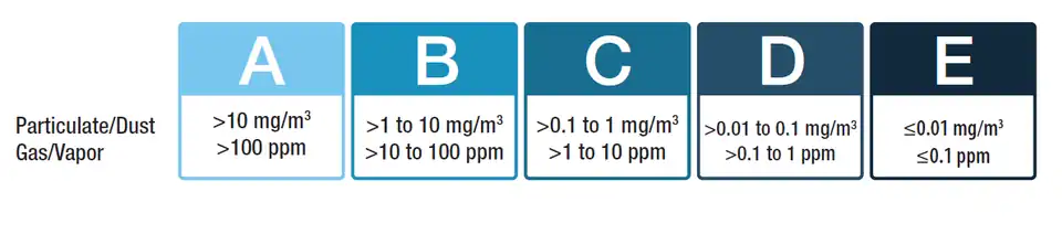 El proceso clasifica las sustancias químicas en una de cinco bandas, designadas de la A a la E. Cada banda está asociada con un rango específico de concentraciones de exposición. La Banda E representa el rango más bajo de concentraciones de exposición, mientras que la Banda A representa el rango más alto. La asignación de una sustancia química a una banda se basa tanto en la potencia de la sustancia química como en la gravedad del efecto sobre la salud. Las bandas A y B incluyen sustancias químicas con efectos reversibles en la salud o que producen efectos adversos sólo en niveles de concentración altos. La banda C, la banda D o la banda E incluyen sustancias químicas con efectos graves o irreversibles y aquellas que causan problemas en rangos de concentración bajos. Los rangos objetivo de concentración en el aire resultantes se muestran en el gráfico: