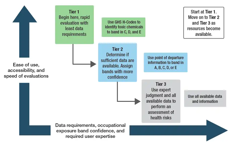 El proceso de bandas de exposición ocupacional de NIOSH utiliza un enfoque de tres niveles. Cada nivel del proceso tiene diferentes requisitos de suficiencia de datos, lo que permite a las partes interesadas utilizar el proceso de bandas de exposición profesional en diversas situaciones diferentes. La selección del nivel más apropiado para una situación de anillado específica depende de la cantidad y calidad de los datos disponibles y de la capacitación y experiencia del usuario.