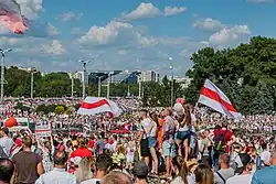 Desde 1995, la bandera blanca-roja-blanca se usa como símbolo de la oposición al régimen de Aleksandr Lukashenko, principalmente en las protestas que siguieron a las elecciones presidenciales de 2006 y 2010 y en las manifestaciones conmemorativas del Día de la Libertad y en las marchas conmemorativas de Dziady. El uso de la bandera de manera pública no se encuentra prohibido pero es considerado por las autoridades un símbolo sin registrar, por lo que su muestra por activistas políticos o hinchas deportivos puede suponer el arresto y la confiscación de las banderas.[14]