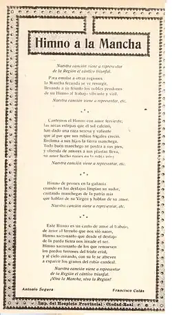 Unos meses antes a la segunda versión de la bandera, el 20 de marzo de 1919, en la revista Vida Manchega, se publica una versión para piano de un Himno a La Mancha, música del director de la banda municipal de Ciudad Real, Antonio Segura Penalba y letra de Martín Ramales. Unos años más tarde, hacia 1927, se divulga una segunda versión de esta letra, por Francisco Colás y el autor musical