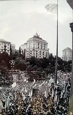Los acontecimientos en los países bálticos pronto llevaron a patrones similares en Ucrania. En particular, el oeste de Ucrania y la capital de la República Socialista Soviética de Ucrania, Kiev, fueron escenario de manifestaciones políticas casi constantes, en las que los manifestantes ondeaban banderas amarillas y azules.