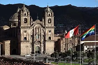 Banderas del Perú y de Cuzco en la plaza de armas de la ciudad.
