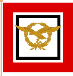 1938-1945 (de facto hasta 1940) | La bandera de Mando del Ministro del Aire del Reich y Comandante en Jefe de la Fuerza Aérea Alemana (reverso) | Esta bandera se introdujo el 28 de abril de 1938. El reverso era idéntico a la versión anterior, excepto por dos bastones de mariscal de campo de la Luftwaffe añadidos. El cambio de bandera se produjo al mismo tiempo que el ascenso de Göring a Generalfeldmarschall (Mariscal de Campo). |