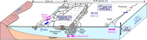 Mientras que el hielo rápido es relativamente estable (porque está adherido a la costa o al lecho marino), el hielo a la deriva (o pack) sufre procesos de deformación relativamente complejos que, en última instancia, dan lugar a la típica gran variedad de paisajes del hielo marino. El viento es la principal fuerza motriz, junto con las corrientes oceánicas.[5][2] También se han invocado el fuerza Coriolis y la inclinación de la superficie del hielo marino.[2] Estas fuerzas motrices inducen un estado de tensión dentro de la zona de hielo a la deriva. Un témpano de hielo que converge hacia otro y empuja contra él generará un estado de compresión en el límite entre ambos. La capa de hielo también puede sufrir un estado de tensión, lo que provoca divergencia y apertura de fisuras. Si dos témpanos se desplazan lateralmente uno al lado del otro sin dejar de estar en contacto, se creará un estado de cizallamiento.