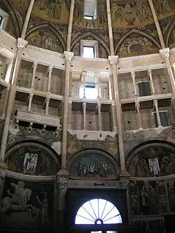 El interior, una única sala en toda la altura, está constituido por 16 arcadas que componen los nichos, cada uno ellos con una escena pintada. Todos son frescos y pinturas que datan de los siglos XIII y XIV. Las 16 caras de la configuración interna, que duplican el octógono externo, evocan el círculo de los doce apóstoles, combinados con los cuatro puntos cardinales, los cuatro evangelistas y las estaciones. Con el paso del tiempo las pinturas han sufrido un deterioro progresivo, ya que no se realizaron con una verdadera técnica al fresco; por ello, comenzaron a desprenderse pronto y el baptisterio tuvo que ser restaurado y consolidado, incluso con el uso de inyecciones e infiltraciones.[2]