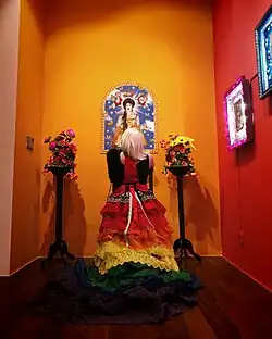 ![]() Alicia Galán frente al altar de Barbarella, durante la exposición Fiesta Marica, CCELP, La Paz | ||