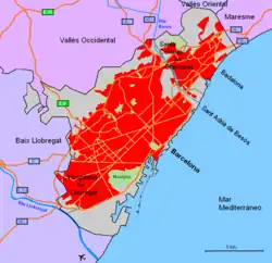 Se compone de cinco municipios: Barcelona, Hospitalet de Llobregat, Badalona, Santa Coloma de Gramanet y San Adrián de Besós. Anteriormente formaron parte de la comarca los municipios de Esplugas de Llobregat y San Justo Desvern, que pasaron a formar parte de la comarca del Bajo Llobregat en 1990.[3]
