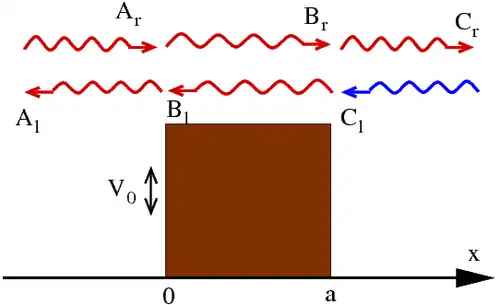 Colisión de una partícula con una barrera de potencial finito de altura . Se indican las amplitudes y sentido (hacia la derecha y hacia la izquierda) de las ondas. Se representan en rojo aquellas ondas usadas para obtener las amplitudes de las ondas reflejadas y transmitidas. En la ilustración se considera el caso .