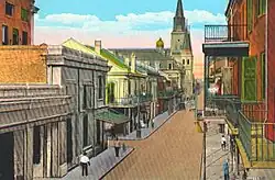 El Barrio Francés: Upper Chartres street mirando hacia Jackson Square y los chapiteles de la catedral de san Luis, años 1910.