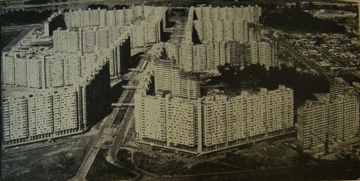La 1º etapa, comprendida por 1000 viviendas, fue inaugurada el 19 de diciembre de 1970,[2] concluyéndose definitivamente en febrero del año siguiente. La 2º etapa, comenzada en agosto de 1971, pasó a estar a cargo del FONAVI en 1972, y se terminó en partes, entre octubre de ese año y marzo de 1973. Al concluirse, se totalizaron 118 edificios en tira, del tipo conocido como monoblocks, de 14 pisos cada uno, con 4 departamentos por piso. La planta baja fue reservada para circulación libre y acceso a las viviendas, ya que se construyeron locales comerciales a la altura del 1º piso, con acceso por escaleras que conducen a galerías elevadas a lo largo de cada tira de edificios. Además, se inauguraron 4 escuelas primarias con jardín de infantes.