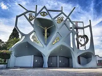La composición arquitectónica de la fachada contiene un gran simbolismo y es rica en valores espirituales. El soporte central se bifurca y forma una gran “V” que representa la victoria de Cristo en el amor y en la paz; en el centro aparece la imagen del Crucificado, en torno a El, la triple función del Sacerdocio: el ojo vigilante del Pastor, las manos oferentes y heridas, y los pies igualmente inmolados; a la derecha aparece estilizada la cruz, instrumento de la redención en cuyo centro aparece un sangrante corazón. Todo el conjunto está rematado por una corona de espinas.[8]