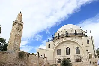 Las cuatro sinagogas sefardíes. Tras la conquista israelí de Jerusalén Este en 1967, se presentó una serie de planes para el diseño de un nuevo edificio. Tras años de deliberación, en 1977 fue reconstruido un arco conmemorativo sobre los escombros del templo dinamitado y ello transformó el sitio en un monumento prominente del barrio judío.[11] El proyecto de reconstruir la sinagoga en su versión dieciochesca recibió la aprobación del Gobierno israelí en 2000, a cargo de la restauración estuvo el arquitecto Nahum Meltzer y dicha restauración fue culminada el 15 de marzo de 2010.