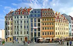 Sin embargo, un número relativamente grande de casas barrocas en el inneren Neustadt, especialmente alrededor de la Dreikönigskirche, habían sobrevivido a la guerra. Sin embargo, como no se pusieron fondos a disposición para una renovación, se permitió que fueran descomponiéndose; La desolación del barrio debería terminar finalmente con la demolición prevista, que, sin embargo, sólo se llevó a cabo en partes. Después de 1990 se renovaron los numerosos edificios barrocos conservados. En esta zona de casas barrocas de Dresde, conocida como barrio barroco de Königstraße, alrededor de Königstraße y Rähnitzgasse, se ha conservado el tejido constructivo barroco en todos sus detalles, especialmente en las escaleras, los patios interiores y los pasillos, hasta las hojas originales de las puertas y ventanas.