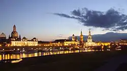 - Dreikönigskirche (1732-1739) (Iglesia de la Epifanía), obra de Pöppelmann, interior de Bähr y ejecución de Schmidt y Fehre. Reconstrucción idéntica en 1984-1991.