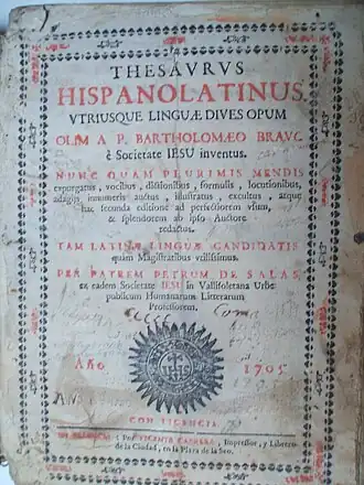 - Thesaurus hispano latinus utriusque linguae dives opum (Valladolid, 1654). Es el Thesaurus verborum ac phrasium de Bravo corregido por otros gramáticos. Otros ejemplares: