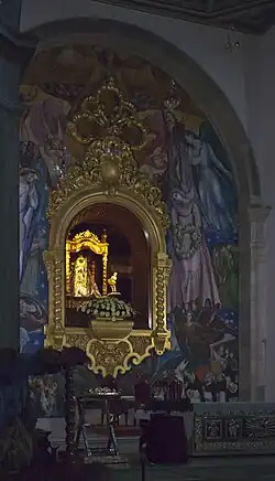 En el altar mayor el ara es de mármol. En las paredes laterales se encuentra una estructura dispuesta en pisos sucesivos de puerta, ventanal y balconada de celosías. El retablo está enmarcado por un arco de medio punto de piedra que descansa en pilastras de capitel dórico. En su centro se encuentra el nicho de la Patrona ligeramente hundido en forma de arco de medio punto enmarcado por casetones de caoba, inserto en un segundo con columnas de fuste salomónico. El monumental mural del presbiterio que cubre el fondo de la Basílica es también de Aguiar. Presenta dos planos, uno terrestre y otro celestial, los dos con grandes figuras alegóricas y terrenales. El izquierdo muestra en su parte inferior a nueve dominicos y a su cabeza al obispo Pérez Cáceres. Lo corona como eje central el Espíritu Santo en forma de paloma, 19 figuras en actitud piadosa suplican su clemencia, entre las que se encuentran hombres, mujeres y niños. En un lateral del altar mayor se encuentra la bandera de la Ciudad del Vaticano, en referencia a la estrecha vinculación del Santuario con el Papado debido a su condición de Basílica menor.