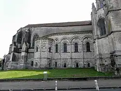 Esta riqueza ornamental se encuentra también en los muros exteriores de los colaterales y las capillas laterales del coro. Así, los muros de los colaterales se levantan en tres niveles, es decir, dos niveles de arcadas semicirculares separadas por un muro macizo. Contrafuertes-columnas separan grandes arcos adornados con dientes de lobo o abren, en la parte superior, grandes vanos románicos rematados por óculos, mientras que el nivel inferior da fe de una mayor sobriedad, pero retoma un patrón bastante cerrado. Así, pequeños vanos semicirculares iluminan la iglesia inferior. Finalmente, las capillas laterales desarrollan cuatro niveles de alzado: friso de arcos de medio punto en la parte superior, luego vanos enmarcados por columnillas alternadas con arcadas ciegas, muro macizo y nueva serie de vanos de medio punto en el nivel inferior.