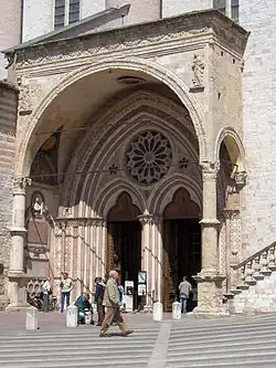 Debido a la pendiente de la colina, la entrada fue trasladada al lado izquierdo de la nave. El ingreso tiene lugar a través de un elegante portal gótico de la segunda mitad del siglo XIII, sobrepasado por un rosetón definido por el historiador Adolfo Venturi como «el rosetón más bello del mundo»,[18] y precedido por un atrio renacentista obra del escultor Francisco di Bartolomeo da Pietrasanta. Está compuesto por un arco sustentado por dos columnas con ático decorado por un friso con dos festones. Los mosaicos y mayólicas coloreadas de la parte superior, del siglo XIII, se encuentran hoy casi desaparecidos por completo. El portal, concluido antes de 1271, tiene dos puertas de madera realizadas por artistas de Umbría del siglo XVI.