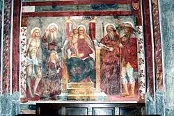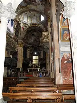 En el muro de la nave izquierda hay un gran fresco que representa en la parte superior la Trinidad y en la parte inferior las Historias de San Julio .