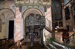 Las piezas de arte más antiguas están representadas por el ambón románico y por los frescos de las paredes de las naves laterales y de los pilares de la iglesia, que datan de los siglos XIV a XVI.