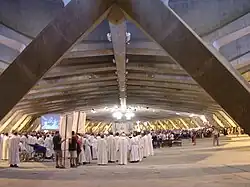 De forma elipsoidal, su largo es 201 mètres, su ancho es 81 metros con una altura en el centro de sólo 10 metros. Tiene una superficie de 12 000 m2, y puede albergar hasta 25 000 personas.[1][4] Su estructura hizo un amplio uso de la técnica del hormigón pretensado. Tiene dos grandes entradas axialmente opuestas; los asientos de los veintinueve pórticos de hormigón pretensado que sostienen la bóveda se proyectan hacia la periferia, permitiendo a todos los fieles ver el altar que se sitúa en su centro, y delimitando hacia el exterior un amplio pasillo de circulación periférico, que conduce a rampas y escaleras de acceso desde el exterior.