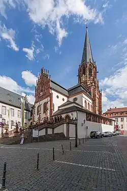 La actual iglesia esta el corazón de un templo románico consagrada en el siglo X. El edificio principal fue construido como una basílica romana, otras fases fueron construidas en el estilo gótico temprano. La iglesia tiene un rico patrimonio artístico, parte del cual se exhiben en el Museo de la Abadía de Aschaffenburg. Desde 1958 la iglesia tiene el estatus de basílica menor.