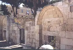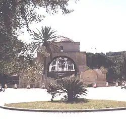 Tras la fachada se accede al piso del desaparecido brazo oeste, más allá del cual se encuentra el actual acceso a la iglesia, abierto sobre una vidriera de espejo sostenida por un marco de metal oscuro. Esta solución, empleada en las restauraciones entre el año 1978 y 1996 fue aplicada para cerrar los tres arcones mediante los que los tres brazos desaparecidos se unían al cuerpo central con la cúpula; para hacer esto, se demolieron los muros alzados en 1947 que servían para cerrar las arcadas.