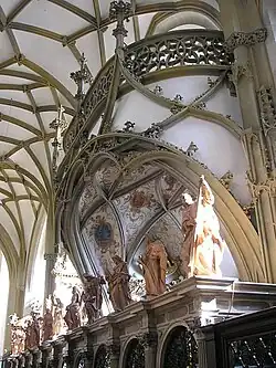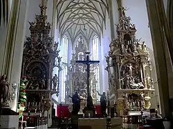El edificio es un gran ejemplo de la arquitectura gótica en Alemania; en su interior se conserva tres altares enormes y muy preciosos de finales del Renacimiento, considerados obras maestras de la escultura alemana del período. Su alto campanario "acebollado", que domina la ciudad del sur, sirvió como prototipo para la construcción de numerosas torres barrocas de Baviera.