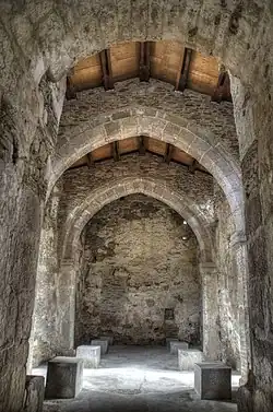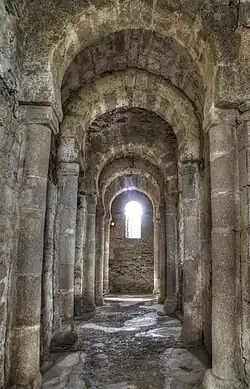 Actualmente están cubiertas la nave, el crucero y los ábsides con bóveda de cañón de sección de herradura, salvo en los tramos de crucero que preceden a cada ábside, donde debió haber estructuras de ladrillo en forma de pequeña cúpula o cimborrio más elevado con bóveda de aristas, hoy desaparecidos. En el crucero hay doce columnas adosadas al muro, que se corresponden con los arcos que inician cada tramo de abovedamiento. Es un espacio sobrio pero armónico, con una arquitectura que en origen estuvo adornada con finas impostas de mármol con diversos motivos de roleos, algunas ya arrancadas, pero otras todavía in situ confirmando la cronología visigoda del edificio.[6]