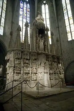 En muchas de las capillas laterales de la iglesia hay lápidas y sepulcros con inscripciones góticas y estatuas yacentes. Las grandes capillas de la Purísima Sangre y Nuestra Señora de los Dolores presentan decoración barroca.