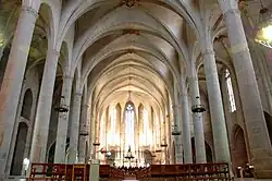 En el interior, paradigma del gótico mediterráneo, contiene las singulares y grandes pilas bautismales románicas del siglo XI, dos sarcófagos condales y un vitral gótico, el retablo de Nuestra Señora de los Dolores del siglo XVIII, el órgano del siglo XIX y muchos otros elementos de interés.