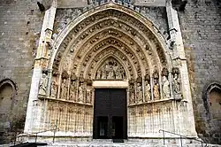 La fachada principal presenta una gran portada de piedra del siglo XV, atribuida al maestro de obras Antonio Antigó, y está dividida en tres espacios: dos torres campanarios y un cuerpo central. Esta parte central posee la portada, enmarcada entre dos pináculos. Destaca su belleza formada por seis arquivoltas que delimitan el tímpano y el frontón. En el tímpano se encuentra representada la Adoración de los Reyes Magos. Las seis arquivoltas están rematadas por doce hornacinas que albergan a los doce apóstoles. Todas las esculturas son talladas con gran perfección y profusión de detalles. Bajo las hornacinas, un zócalo con ventanas ciegas descansa en un banco. Encima de la portada y ocupando la parte superior del cuerpo central, se despliega un gran rosetón gótico, que da luz al interior del templo. En el lado norte se alza el campanario (de los siglos XII o XIII). Se trata de una torre dividida en cinco plantas con una altura de 36 metros que sigue todavía la composición arquitectónica de los campanarios románicos de influencia lombarda. Se observan aberturas de arcos de medio punto con columnas y capiteles, frisos de arcos y dientes de sierra. Algunos de estos elementos muestran sin embargo, una clara orientación hacia el estilo gótico.