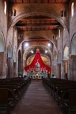 La basílica tiene tres naves con un transepto más bajo que el cuerpo longitudinal. Fue una de las primeras iglesias en Italia que estuvo cubierta con una bóveda de crucería en las naves laterales, antes de que se difundiese el estilo románico. La fachada era muy sólida con las antiguas murallas castellanas; después de un sismo o un derrumbe, que algunos achacan al terremoto del año 1117, los primeros tres intercolumnios fueron abandonados y se construyó una fachada cerrando uno de los arcos diafragma.
