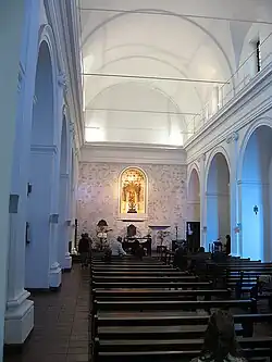 Conserva la concepción original de una sola nave flanqueada por capillas laterales con muros portugueses de mampostería de piedra y de ladrillo y cubierta con bóveda de cañón.