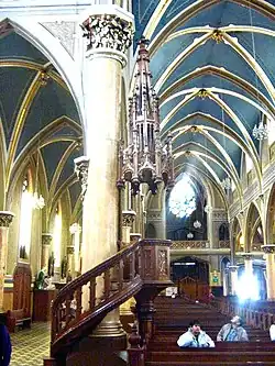Púlpito de la Basílica ubicado en la parte derecha de la nave central. Talla en madera. Al fondo las puertas y el rosetón.