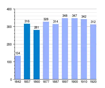 | Gráfica de evolución demográfica de Basarán[1] entre 1842 y 1920 |