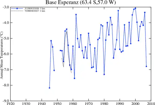 - ↑ «Weatherbase: Historical Weather for Base Esperanza». Weatherbase.