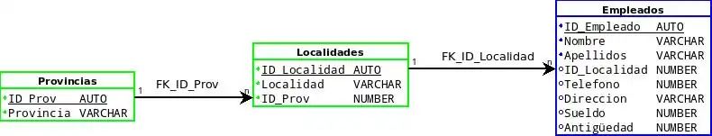 Por ejemplo, el código de departamento puede ser una clave foránea en la tabla de empleados. Se permite que haya varios empleados en un mismo departamento, pero habrá uno y solo un departamento por cada clave distinta de departamento en la tabla de departamentos.